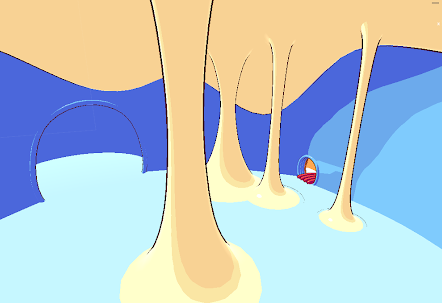 The protagonist of the game is a jawbreaker candy. This feature informs the main character’s abilities. Initially, the jawbreaker will have access to movement on foot, jumping, an attack with a sword, a parry, and a dodge. This skill set has two secondary reactionary abilities: if a dodge is held the character will retract their limbs inwards and begin to roll, and every time the character is damaged they will lose layers and reduce in size.